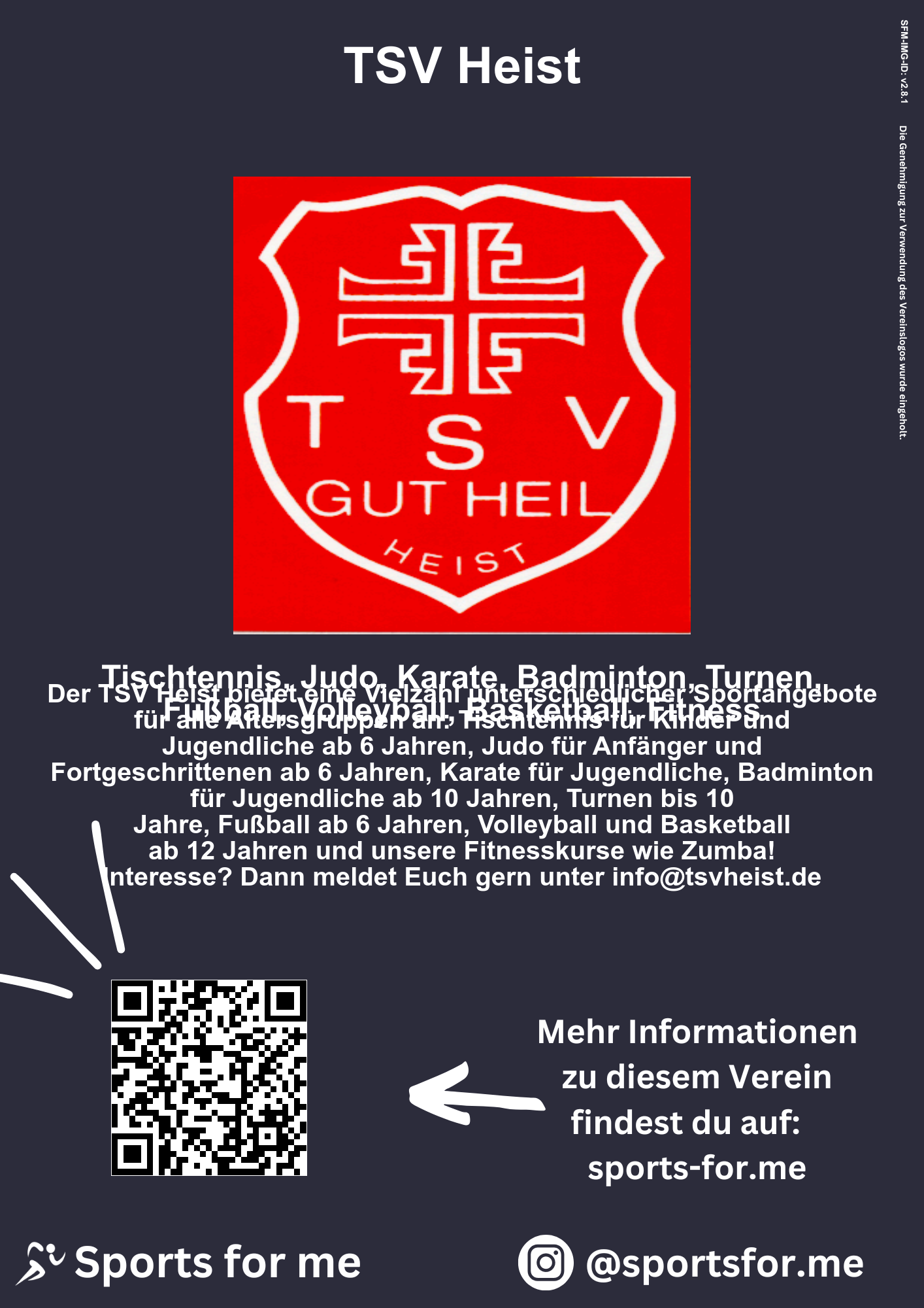 Der TSV Heist bietet eine Vielzahl unterschiedlicher Sportangebote für alle Altersgruppen an: Tischtennis für Kinder und Jugendliche ab 6 Jahren, Judo für Anfänger und Fortgeschrittenen ab 6 Jahren, Karate für Jugendliche, Badminton für Jugendliche ab 10 Jahren, Turnen bis 10 Jahre, Fußball ab 6 Jahren, Volleyball und Basketball ab 12 Jahren und unsere Fitnesskurse wie Zumba! Interesse? Dann meldet Euch gern unter info@tsvheist.de